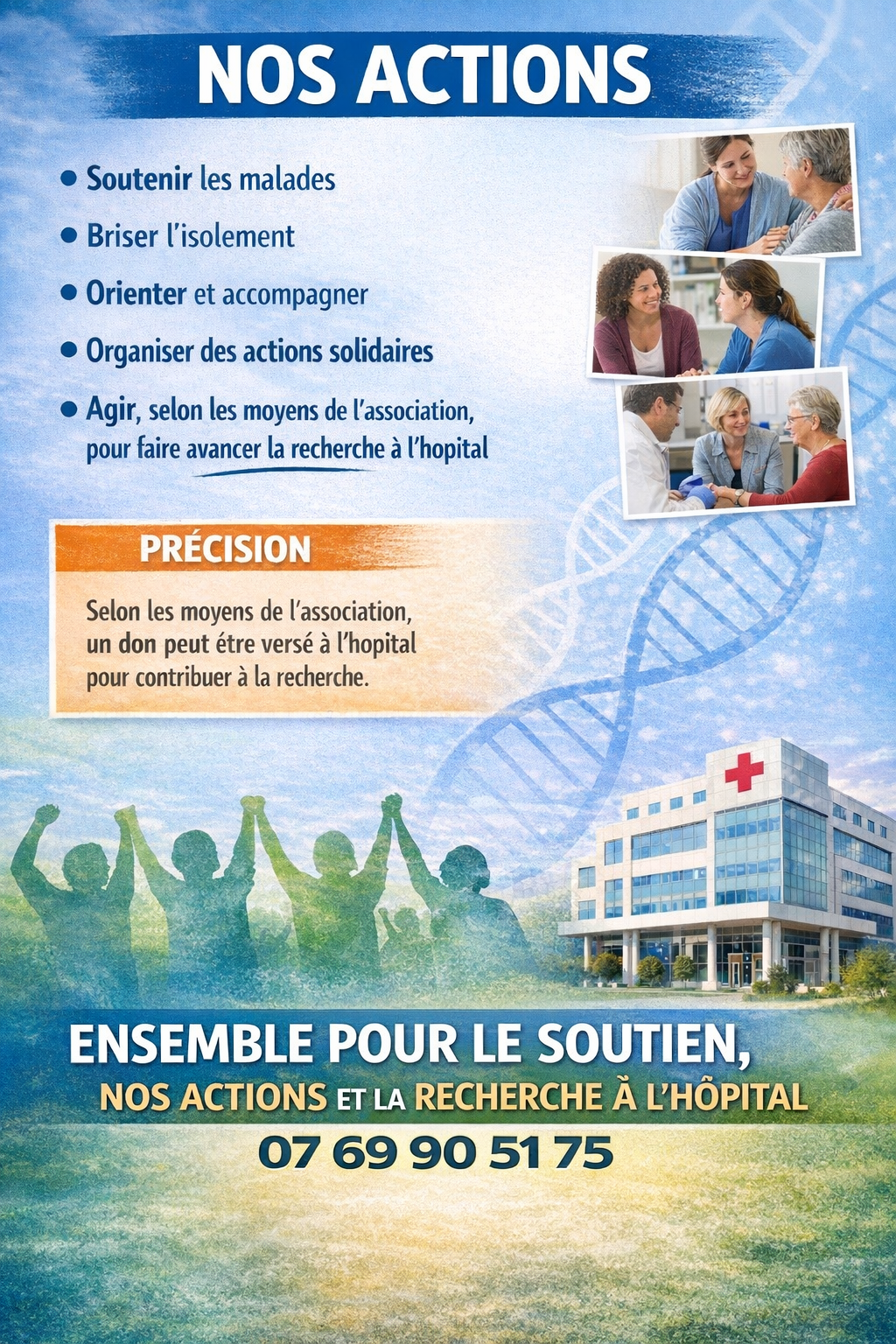 Ce qui rend nos actions spéciales, c’est l’écoute attentive, la solidarité et la proximité que nous offrons aux personnes atteintes de fibromyalgie. Nous accompagnons les malades grâce à nos conseils personnalisés, notre orientation et nos groupes de soutien, présents et en ligne, afin de rompre l’isolement et d'améliorer leur quotidien. Nous agissons avec passion pour soutenir les malades et faire avancer la recherche, main dans la main avec les hôpitaux et l'État.